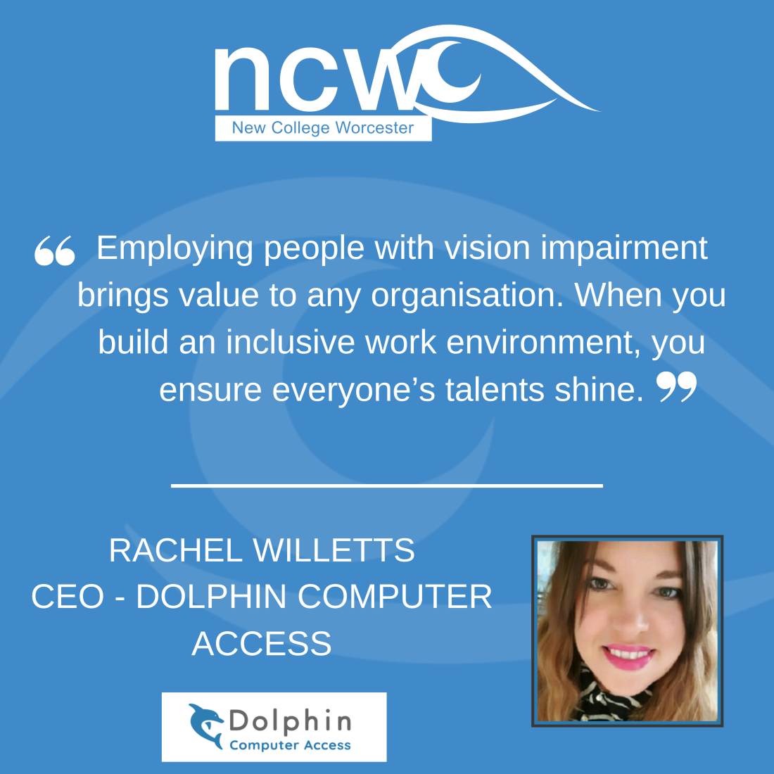 Rachel believes that the landscape has shifted massively in favour of visually impaired employees in the 17 years that she’s been at Dolphin and that raising awareness among employers is still critical if we are going to bridge the gap in employment rates.